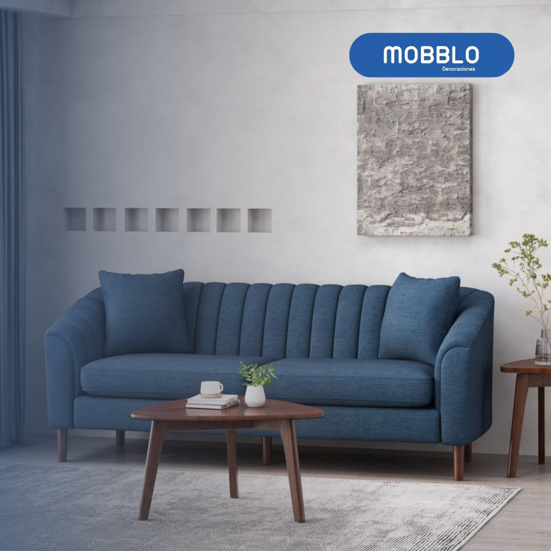 Este sofá está fabricado en madera y espumas certificadas, ofreciendo un nivel medio de confort. Está tapizado en tela tipo lino de alta durabilidad y suave al tacto, en un elegante color azul, y cuenta con patas de madera en tono natural oscuro.